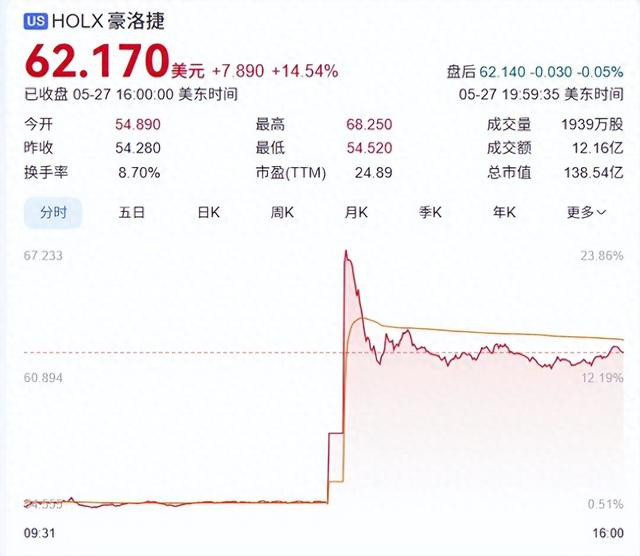 从资本市场来看,截至美东时间5月27日,豪洛捷以54.89美元/股开盘,单日最高股价为68.25美元,最终以62.17美元/股收盘,收盘价上涨14.54%。公司总市值138.54亿美元。