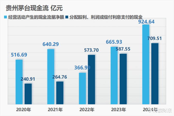 2024年贵州茅台分配股利支付的现金创新高,达到了709.51亿元;但是公司经营现金净流入924.64亿元;虽然花得多,但是赚得也多。