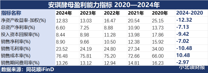 如下表所示,近5年安琪酵母的各项盈利指标几乎都是腰斩。