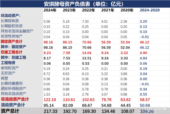 如下表所示,5年时间安琪酵母的非流动资产增长了58.57亿元,其中固定资产增长了46.12亿元,在建工程增长了4.9亿元,其他非流动资产科目增长额度较小。